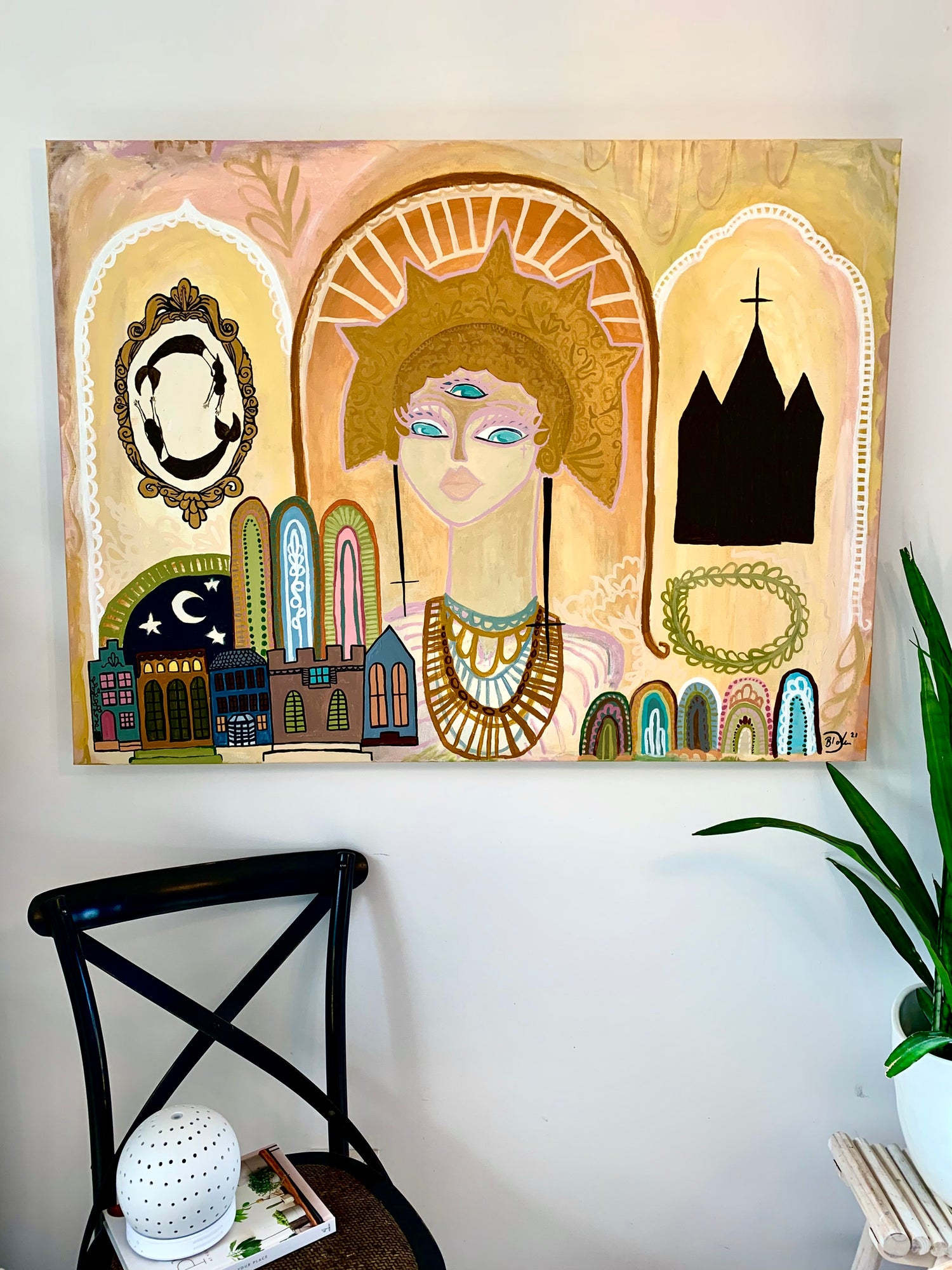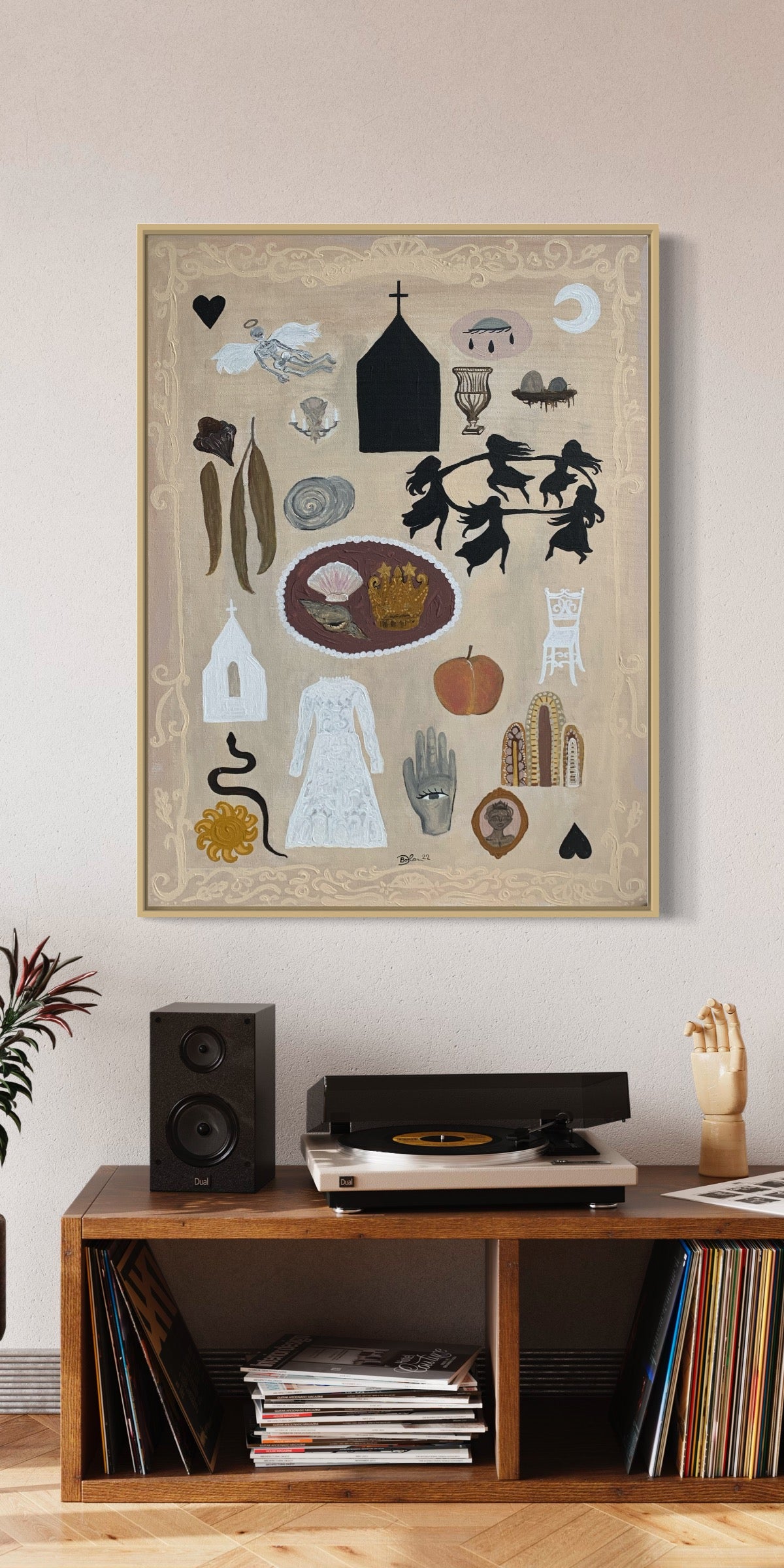 Visit the land of my imagination and be witness to “The Ceremony”. A nested story depicting tales of love, sisterhood and the path to discovery. Think ‘Little Women’ meets ‘Midsommar’- A body of work connected and animated to the mesmerising ‘Dance Fever’ album by Florence and the Machine. A deep and personal record inspired by Florence’s discovery of the medieval European ‘dancing plague’ wherein hordes of people dance until exhaustion, injury or death. Fascinated with this concept, the start of the pandemic and their continuing dedication to performance, Florence and the Machine’s grandiose creation has transformed my practice and heavily influenced the process. With support of the fourteen song masterpiece I have specifically curated each painting in this ‘Russian Doll’ chronicle to create a visual musical.